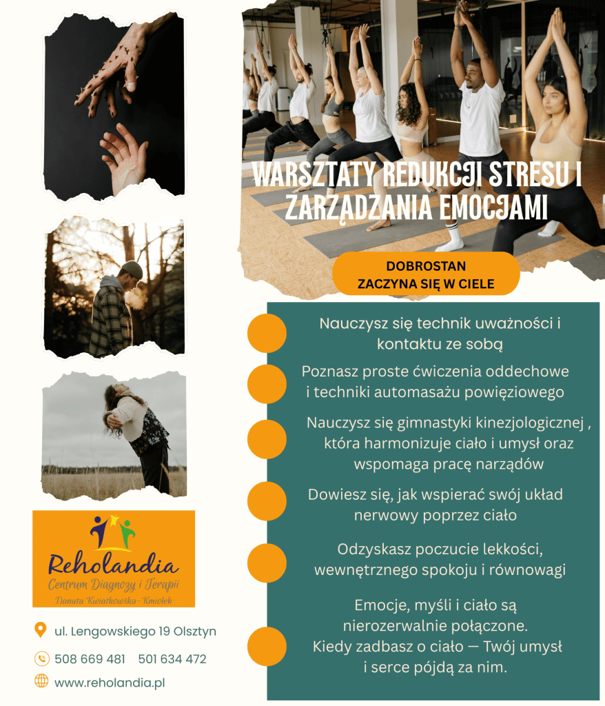Warsztat Redukcji Stresu i Zarządzania Emocjami – 22.05.2026 Termin: 22.05.2026 (piątek)Godz. 17:00–20:00 Miejsce: Reholandia Centrum Diagnozy i Terapiiul. Lengowskiego 19, Olsztyn Dla osób, które: czują, że stres przejmuje kontrolę nad ich ciałem i emocjami chcą nauczyć się skutecznych technik wyciszenia chcą lepiej rozumieć swoje emocje Czego dowiesz się i doświadczysz?: czym jest […]